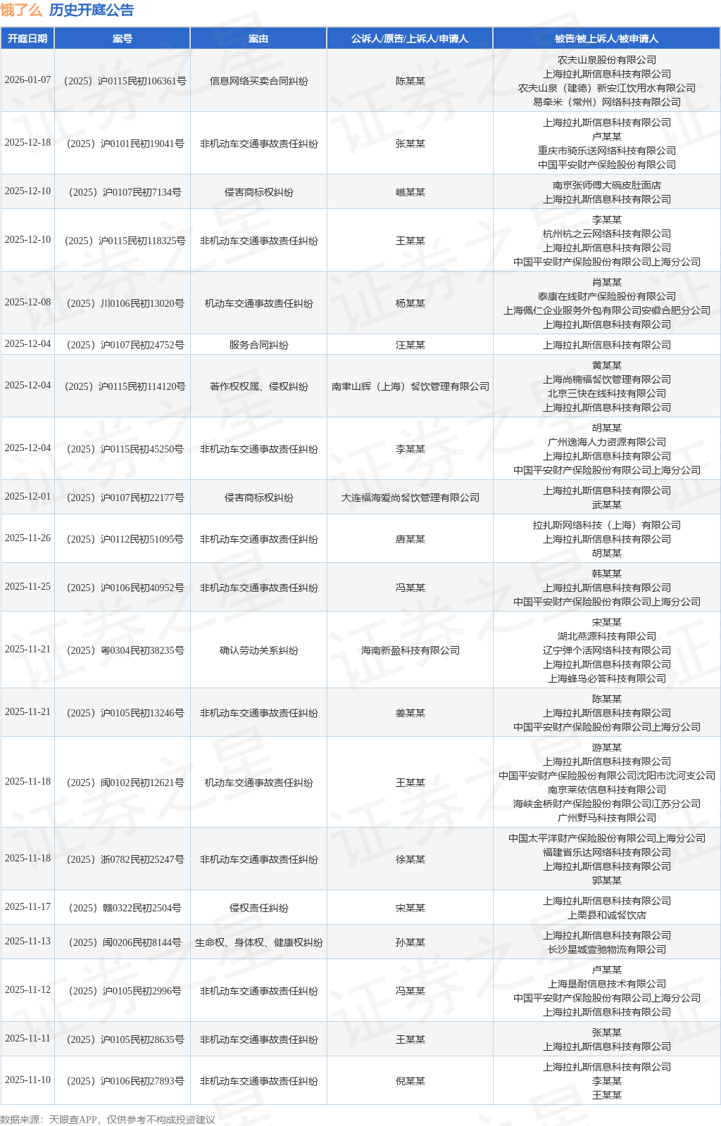 案号:(2025)沪0105民初13246号根据统计,近一年内以上海拉扎斯信息科技有限公司为当事人的历史开庭公告有418则,其中案由为“非机动车交通事故责任纠纷”的公告以235则居首,其次为“机动车交通事故责任纠纷”有48则,“侵害商标权纠纷”有47则。历史开庭公告(前20条)如下: