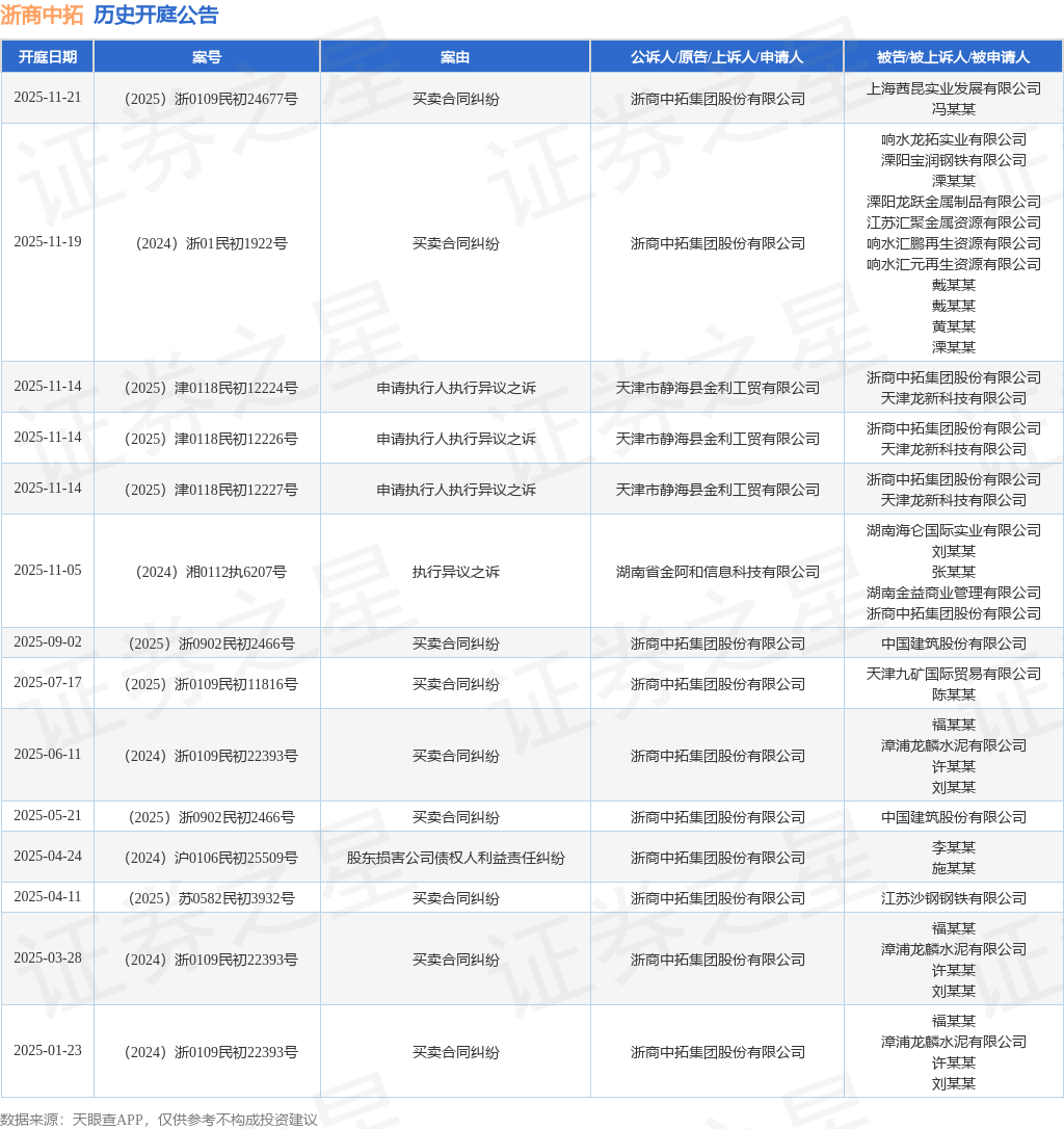 案号:(2025)浙0109民初24677号根据统计,近一年内以浙商中拓集团股份有限公司为当事人的历史开庭公告有14则,其中案由为“买卖合同纠纷”的公告以9则居首,其次为“申请执行人执行异议之诉”有3则,“执行异议之诉”有1则。历史开庭公告如下:
