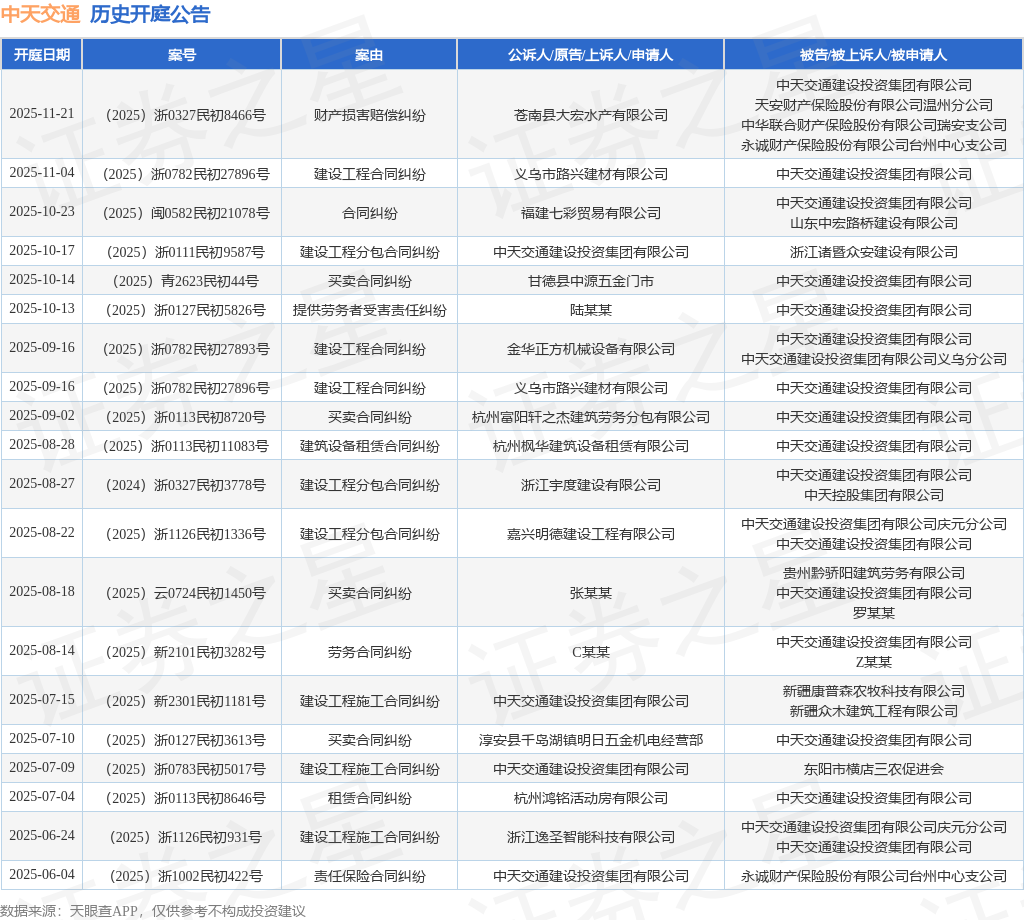 案号:(2025)浙0327民初8466号根据统计,近一年内以中天交通建设投资集团有限公司为当事人的历史开庭公告有41则,其中案由为“买卖合同纠纷”的公告以11则居首,其次为“建设工程施工合同纠纷”有8则,“建设工程分包合同纠纷”有4则。历史开庭公告(前20条)如下: