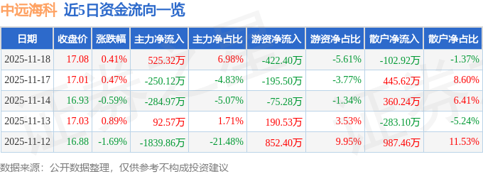 证券之星消息,截至2025年11月18日收盘,中远海科(002401)报收于17.08元,上涨0.41%,换手率1.19%,成交量4.41万手,成交额7523.67万元。