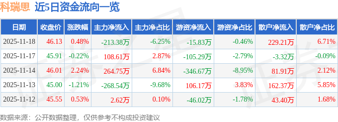 证券之星消息,截至2025年11月18日收盘,科瑞思(301314)报收于46.13元,上涨0.48%,换手率4.57%,成交量7428.0手,成交额3414.05万元。