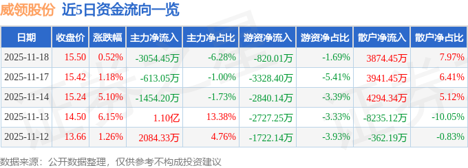 证券之星消息,截至2025年11月18日收盘,威领股份(002667)报收于15.5元,上涨0.52%,换手率13.44%,成交量31.79万手,成交额4.86亿元。
