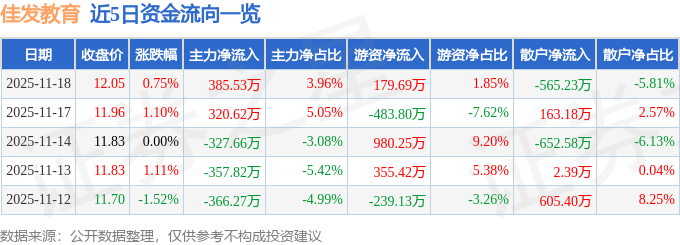 证券之星消息,截至2025年11月18日收盘,佳发教育(300559)报收于12.05元,上涨0.75%,换手率2.61%,成交量8.13万手,成交额9726.82万元。
