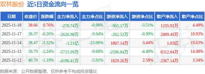 证券之星消息,截至2025年11月18日收盘,双林股份(300100)报收于38.66元,上涨0.76%,换手率1.3%,成交量7.17万手,成交额2.75亿元。