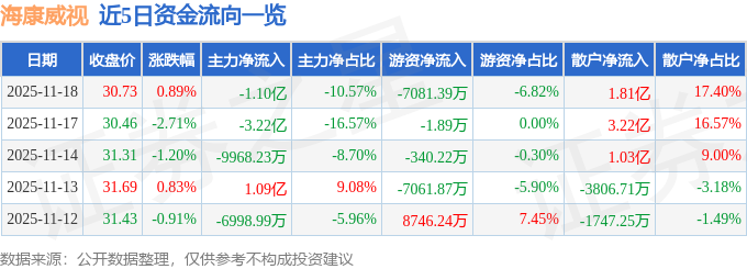 证券之星消息,截至2025年11月18日收盘,海康威视(002415)报收于30.73元,上涨0.89%,换手率0.37%,成交量33.84万手,成交额10.38亿元。