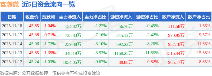 11月18日的资金流向数据方面,主力资金净流出154.82万元,占总成交额1.22%,游资资金净流出56.76万元,占总成交额0.45%,散户资金净流入211.58万元,占总成交额1.66%。