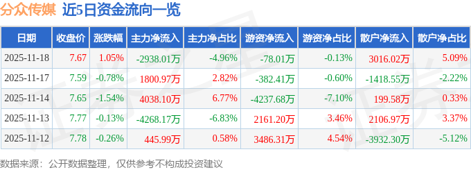 11月18日的资金流向数据方面,主力资金净流出2938.01万元,占总成交额4.96%,游资资金净流出78.01万元,占总成交额0.13%,散户资金净流入3016.02万元,占总成交额5.09%。