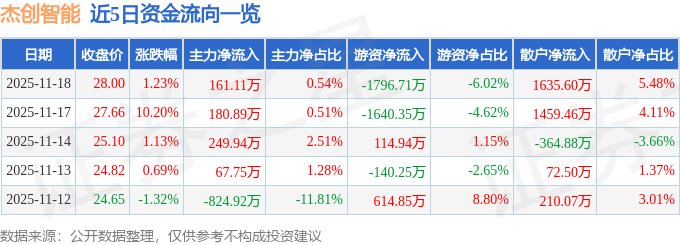 证券之星消息,截至2025年11月18日收盘,杰创智能(301248)报收于28.0元,上涨1.23%,换手率9.61%,成交量10.79万手,成交额2.98亿元。