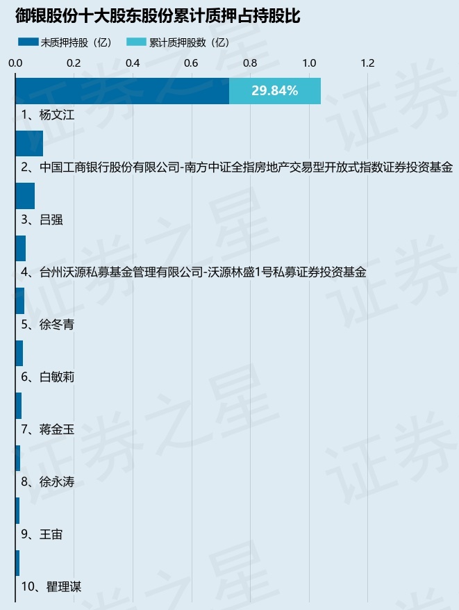 截止本公告日,股东杨文江已累计质押股份3105.0万股,占其持股总数的29.84%。本次质押后御银股份十大股东的累计质押股份占持股比例(占持股比例的计算以公司最新一期财务报表公布的十大股东的持股总数为基准)见下图: