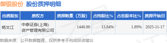 证券之星消息,御银股份(002177)11月19日公开信息显示,股东杨文江向中泰证券(上海)资产管理有限公司合计质押1440.0万股,占总股本1.89%。质押详情见下表: