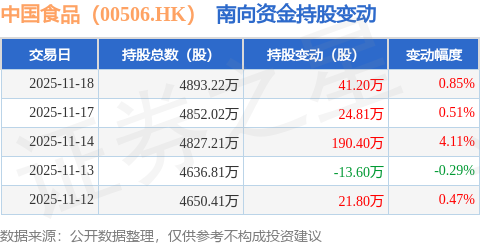 证券之星消息,11月18日南向资金增持41.2万股中国食品(00506.HK)。近5个交易日中,获南向资金增持的有4天,累计净增持264.61万股。近20个交易日中,获南向资金增持的有19天,累计净增持1392.01万股。截至目前,南向资金持有中国食品(00506.HK)4893.22万股,占公司已发行普通股的1.74%。