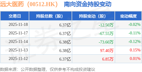 证券之星消息,11月18日南向资金减持12.5万股远大医药(00512.HK)。近5个交易日中,获南向资金减持的有3天,累计净减持49.4万股。近20个交易日中,获南向资金增持的有13天,累计净增持691.15万股。截至目前,南向资金持有远大医药(00512.HK)6.37亿股,占公司已发行普通股的17.93%。