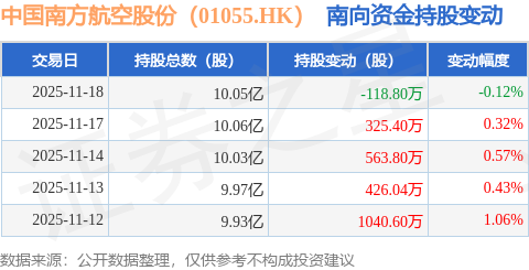 证券之星消息,11月18日南向资金减持118.8万股中国南方航空股份(01055.HK)。近5个交易日中,获南向资金增持的有4天,累计净增持2237.04万股。近20个交易日中,获南向资金增持的有17天,累计净增持9328.95万股。截至目前,南向资金持有中国南方航空股份(01055.HK)10.05亿股,占公司已发行普通股的21.63%。