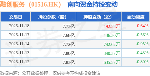 证券之星消息,11月18日南向资金增持492.58万股融创服务(01516.HK)。近5个交易日中,获南向资金减持的有4天,累计净减持1662.28万股。近20个交易日中,获南向资金增持的有13天,累计净增持493.74万股。截至目前,南向资金持有融创服务(01516.HK)7.73亿股,占公司已发行普通股的25.28%。