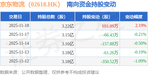 证券之星消息,11月18日南向资金增持691.09万股京东物流(02618.HK)。近5个交易日中,获南向资金增持的有1天,累计净增持55.0万股。近20个交易日中,获南向资金增持的有8天,累计净增持401.33万股。截至目前,南向资金持有京东物流(02618.HK)3.22亿股,占公司已发行普通股的4.83%。