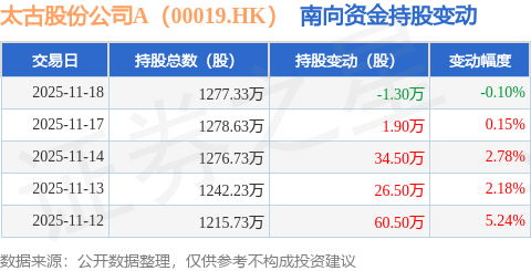 证券之星消息,11月18日南向资金减持1.3万股太古股份公司A(00019.HK)。近5个交易日中,获南向资金增持的有4天,累计净增持122.1万股。近20个交易日中,获南向资金增持的有18天,累计净增持200.6万股。截至目前,南向资金持有太古股份公司A(00019.HK)1277.33万股,占公司已发行普通股的1.63%。
