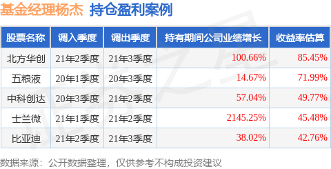 杨杰管理的金信民旺债券A基金在21年2季度买入北方华创,在持有1个季度后在21年3季度卖出。持有期间的估算收益率为85.45%,持有期间北方华创在2020年到2021年的年报归属净利润增幅达100.66%。