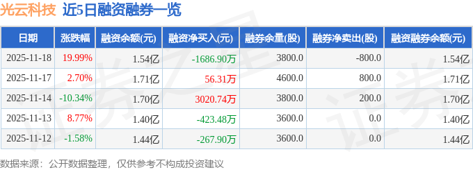 证券之星消息,截至2025年11月18日收盘,光云科技(688365)报收于16.45元,上涨19.99%,涨停,换手率9.16%,成交量39.0万手,成交额5.97亿元。