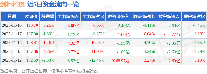 证券之星消息,截至2025年11月18日收盘,剑桥科技(603083)报收于113.7元,上涨6.26%,换手率19.15%,成交量51.33万手,成交额58.4亿元。