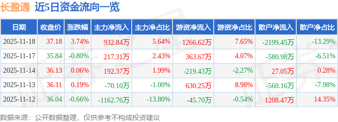 证券之星消息,截至2025年11月18日收盘,长盈通(688143)报收于37.18元,上涨3.74%,换手率4.76%,成交量4.5万手,成交额1.65亿元。