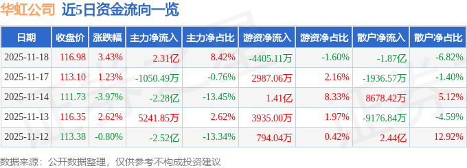 证券之星消息,截至2025年11月18日收盘,华虹公司(688347)报收于116.98元,上涨3.43%,换手率5.72%,成交量23.31万手,成交额27.47亿元。