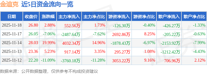 11月18日的资金流向数据方面,主力资金净流入552.56万元,占总成交额1.73%,游资资金净流出126.3万元,占总成交额0.4%,散户资金净流出426.27万元,占总成交额1.33%。