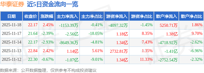 证券之星消息,截至2025年11月18日收盘,华泰证券(601688)报收于22.17元,上涨2.45%,换手率1.74%,成交量127.04万手,成交额28.24亿元。