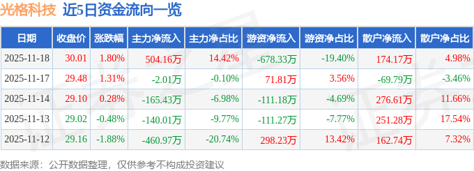 证券之星消息,截至2025年11月18日收盘,光格科技(688450)报收于30.01元,上涨1.8%,换手率2.41%,成交量1.18万手,成交额3495.71万元。