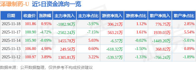证券之星消息,截至2025年11月18日收盘,泽璟制药(688266)报收于101.86元,上涨0.95%,换手率1.0%,成交量2.65万手,成交额2.73亿元。