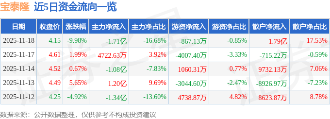 证券之星消息,截至2025年11月18日收盘,宝泰隆(601011)报收于4.15元,下跌9.98%,跌停,换手率12.56%,成交量240.62万手,成交额10.23亿元。
