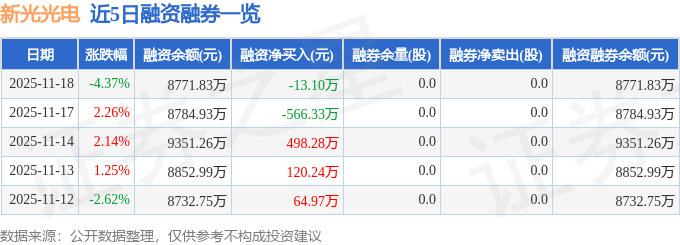 新光光电融资融券信息显示,融资方面,当日融资买入720.48万元,融资偿还733.58万元,融资净偿还13.1万元。融券方面,融券卖出0.0股,融券偿还0.0股,融券余量0.0股,融券余额0.0万元。融资融券余额8771.83万元。