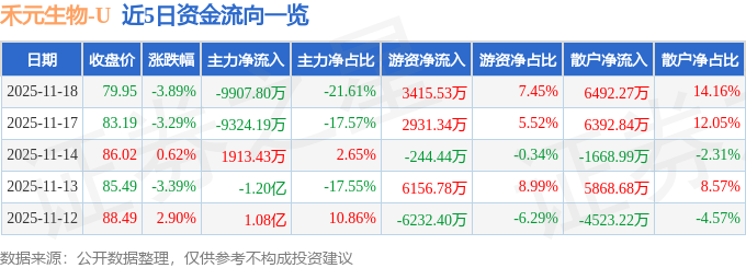 证券之星消息,截至2025年11月18日收盘,禾元生物(688765)报收于79.95元,下跌3.89%,换手率13.86%,成交量5.68万手,成交额4.58亿元。