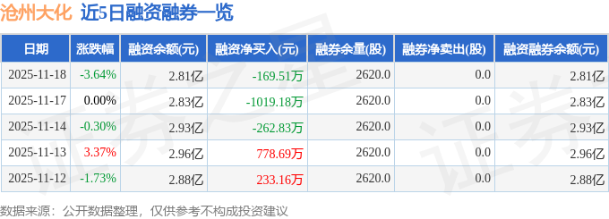 沧州大化融资融券信息显示,融资方面,当日融资买入1702.21万元,融资偿还1871.73万元,融资净偿还169.51万元。融券方面,融券卖出0.0股,融券偿还0.0股,融券余量2620.0股,融券余额3.4万元。融资融券余额2.81亿元。