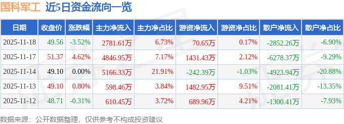 证券之星消息,截至2025年11月18日收盘,国科军工(688543)报收于49.56元,下跌3.52%,换手率7.14%,成交量8.28万手,成交额4.13亿元。