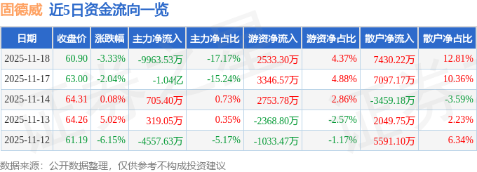 证券之星消息,截至2025年11月18日收盘,固德威(688390)报收于60.9元,下跌3.33%,换手率3.91%,成交量9.51万手,成交额5.8亿元。
