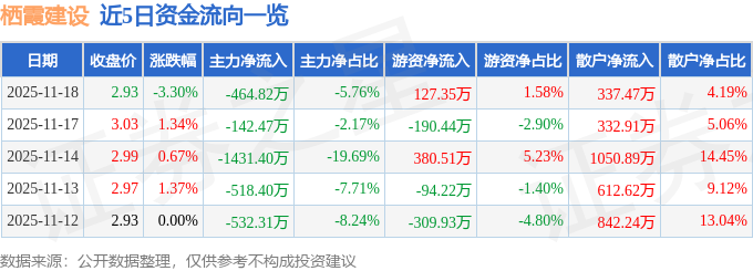 证券之星消息,截至2025年11月18日收盘,栖霞建设(600533)报收于2.93元,下跌3.3%,换手率2.62%,成交量27.49万手,成交额8063.53万元。