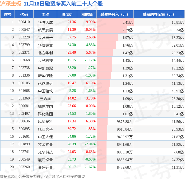 沪深主板融资净买入前三分别为:华胜天成(600410)融资净买入3.41亿元、航天发展(000547)融资净买入2.79亿元、景旺电子(603228)融资净买入1.97亿元,前20具体见下表: