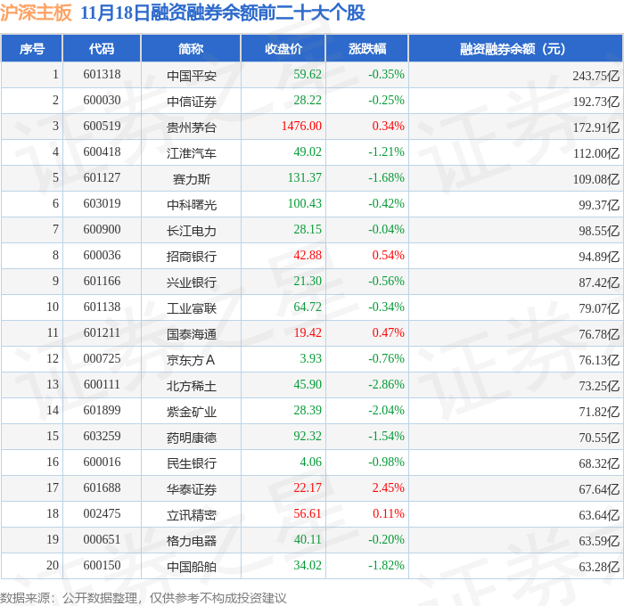 沪深主板融资融券余额前三分别为:中国平安(601318)融资融券余额243.75亿元、中信证券(600030)融资融券余额192.73亿元、贵州茅台(600519)融资融券余额172.91亿元,前20具体见下表: