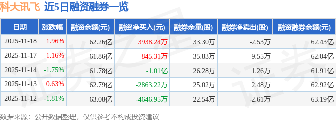 科大讯飞融资融券信息显示,融资方面,当日融资买入3.34亿元,融资偿还2.95亿元,融资净买入3938.24万元。融券方面,融券卖出3.69万股,融券偿还6.22万股,融券余量33.3万股,融券余额1716.83万元。融资融券余额62.43亿元。