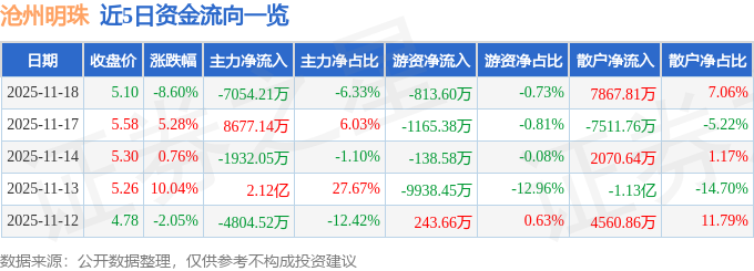 证券之星消息,截至2025年11月18日收盘,沧州明珠(002108)报收于5.1元,下跌8.6%,换手率12.88%,成交量212.23万手,成交额11.15亿元。
