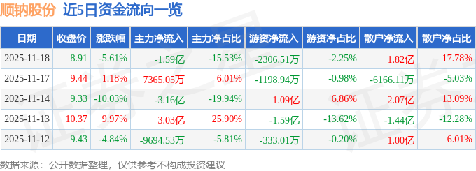 证券之星消息,截至2025年11月18日收盘,顺钠股份(000533)报收于8.91元,下跌5.61%,换手率16.36%,成交量112.06万手,成交额10.25亿元。