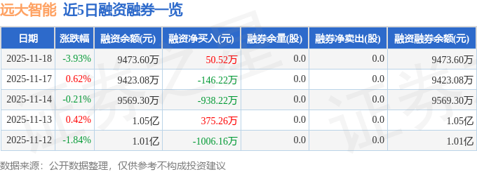 远大智能融资融券信息显示,融资方面,当日融资买入1105.2万元,融资偿还1054.68万元,融资净买入50.52万元。融券方面,融券卖出0.0股,融券偿还0.0股,融券余量0.0股,融券余额0.0万元。融资融券余额9473.6万元。