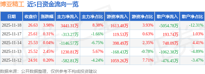 证券之星消息,截至2025年11月18日收盘,博亚精工(300971)报收于26.63元,上涨3.98%,换手率16.92%,成交量15.58万手,成交额4.11亿元。
