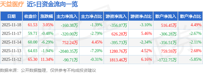 证券之星消息,截至2025年11月18日收盘,天益医疗(301097)报收于61.53元,上涨3.05%,换手率6.64%,成交量1.92万手,成交额1.15亿元。
