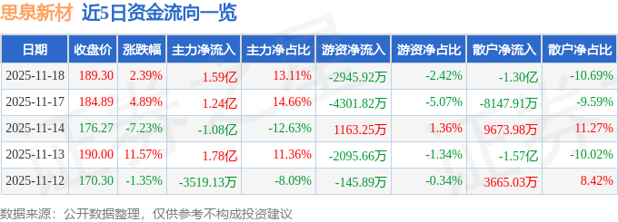 证券之星消息,截至2025年11月18日收盘,思泉新材(301489)报收于189.3元,上涨2.39%,换手率13.49%,成交量6.42万手,成交额12.16亿元。