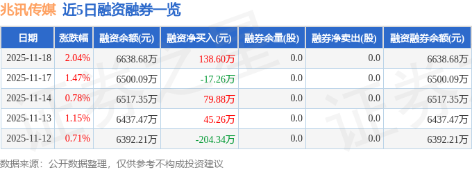 兆讯传媒融资融券信息显示,融资方面,当日融资买入747.46万元,融资偿还608.86万元,融资净买入138.6万元。融券方面,融券卖出0.0股,融券偿还0.0股,融券余量0.0股,融券余额0.0万元。融资融券余额6638.68万元。