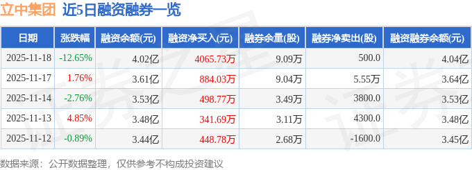 立中集团融资融券信息显示,融资方面,当日融资买入1.11亿元,融资偿还7081.96万元,融资净买入4065.73万元,连续3日净买入累计5448.53万元。融券方面,融券卖出500.0股,融券偿还0.0股,融券余量9.09万股,融券余额202.07万元。融资融券余额4.04亿元。
