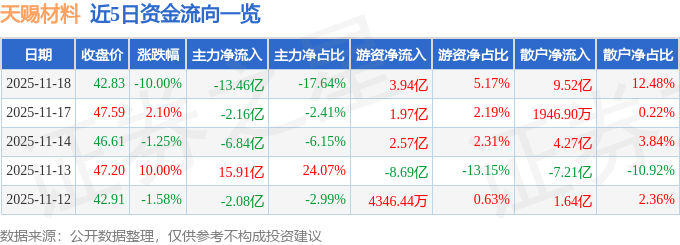 证券之星消息,截至2025年11月18日收盘,天赐材料(002709)报收于42.83元,下跌10.0%,跌停,换手率11.74%,成交量172.88万手,成交额76.27亿元。