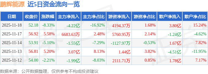 证券之星消息,截至2025年11月18日收盘,鹏辉能源(300438)报收于52.18元,下跌8.33%,换手率11.55%,成交量46.68万手,成交额24.95亿元。