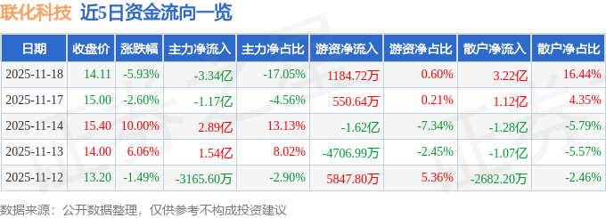 证券之星消息,截至2025年11月18日收盘,联化科技(002250)报收于14.11元,下跌5.93%,换手率15.26%,成交量136.57万手,成交额19.59亿元。